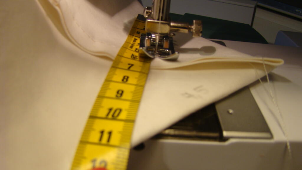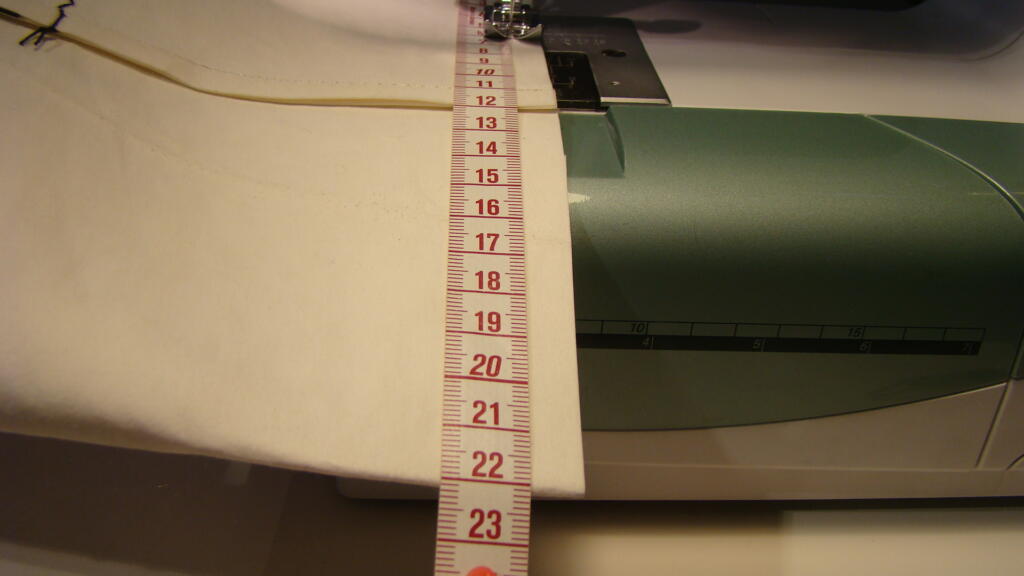 Wywijamy górne brzegi osłonki na zewnątrz. Zastosowałam podwójne wywinięcie na 2 cm i 3,5 cm .