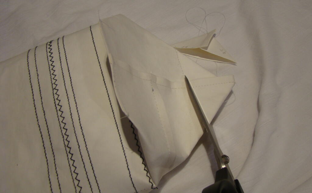 Trójkąty, które nam powstały po zszyciu obcinamy, pozostawiając ok 0,5 cm zapasu przy szwie. WASHPAPA nie strzępi się, brzegi wyglądają estetycznie.