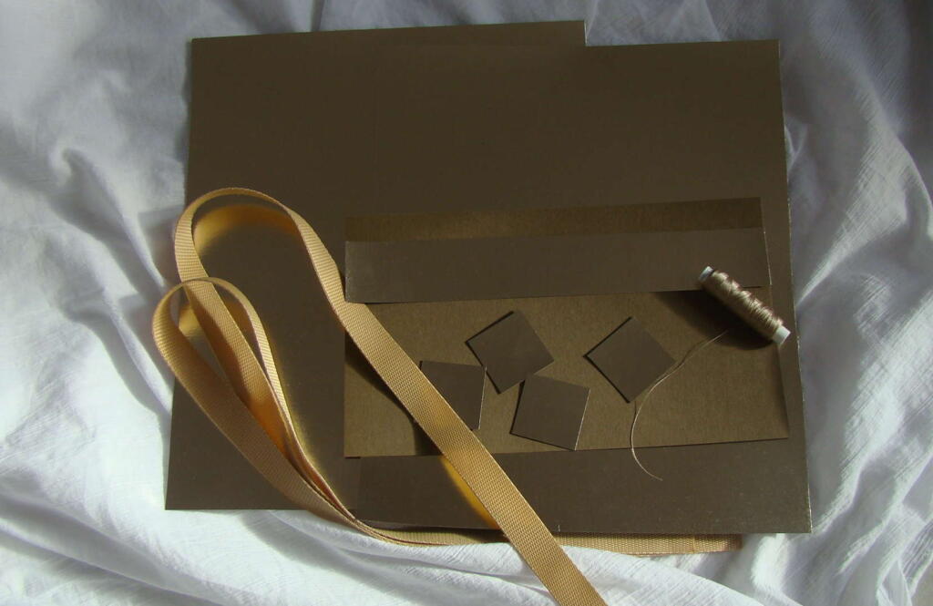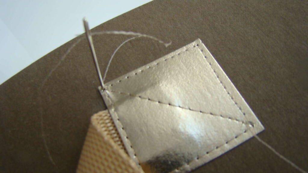 - Cztery kwadraty WASHPAPY LAMINA + PLATYNA o wymiarach 4,5 cm x 4,5 cm, które zastosujemy jako maskowanie przeszyć taśmy nośnej wewnątrz torebki.